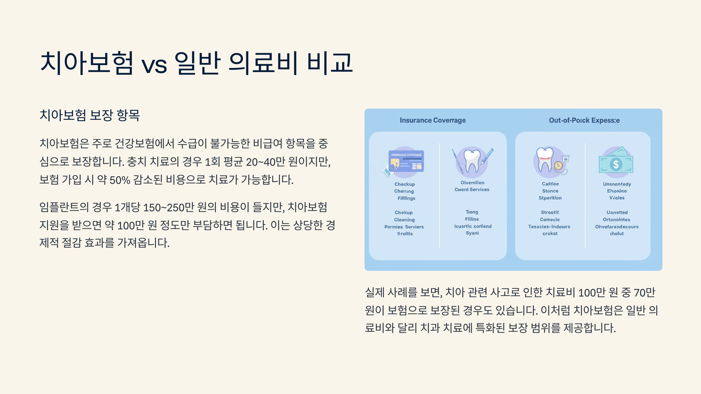 또 다른 한계는 보장 범위의 제한이에요. 미용 목적의 치료나 교정, 임플란트 등은 보장에서 제외되거나 보장 비율이 낮은 경우가 많아요. 특히 가장 비용이 많이 드는 임플란트의 경우, 보험에서 50% 정도만 보장하는 경우가 대부분이어서 여전히 상당한 본인 부담이 발생해요.