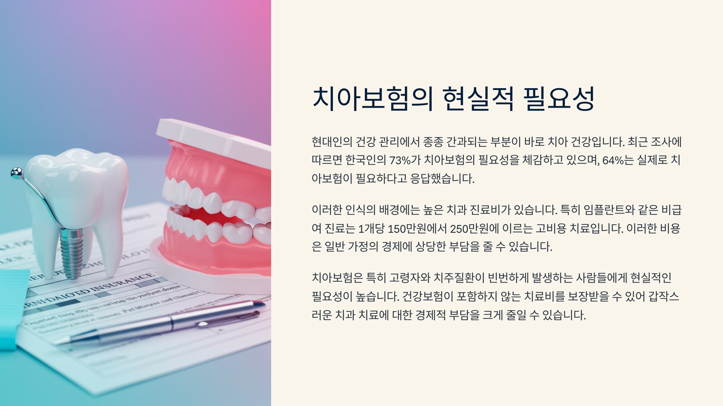 치아 보험에 대한 관심이 높아지고 있지만, 정말 필요한지 확신이 서지 않는 분들이 많아요. 치과 치료비가 비싸다는 건 알지만, 보험료를 내면서까지 가입해야 할지 고민되죠. 특히 2025년 현재 다양한 치아 보험 상품들이 출시되면서 선택의 폭이 넓어진 만큼, 더욱 신중한 판단이 필요해요.