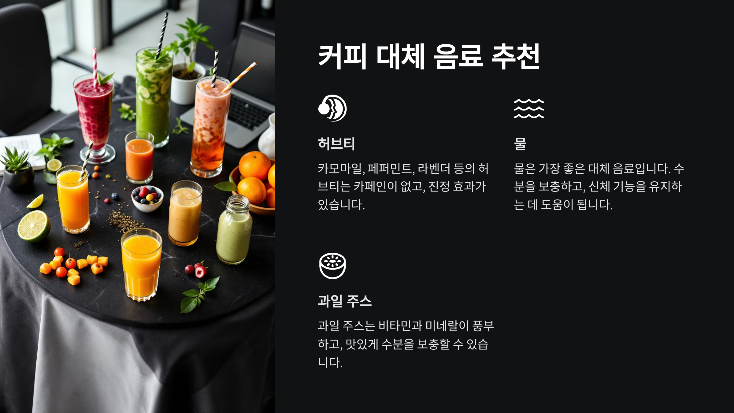 커피 대신 마실 수 있는 건강한 대체 음료들을 소개할게요. 카페인이 없는 음료로도 충분히 활력을 얻을 수 있어요! 🌿
