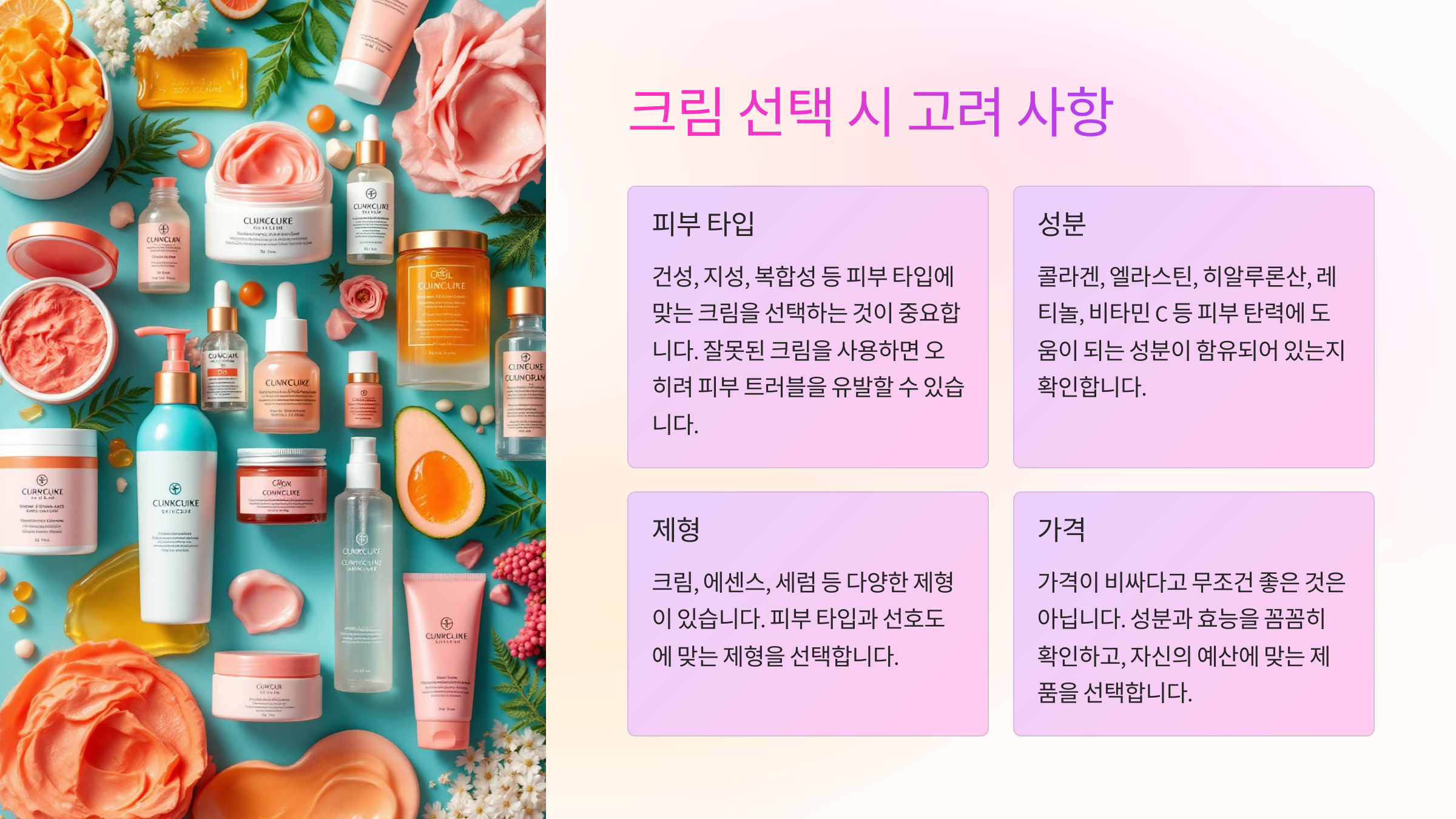 또한, 피부 흡수력을 높이기 위해 크림의 텍스처도 중요해요. 가벼운 제형의 크림은 흡수가 빠르지만, 보습이 오래 지속되는 제품이 필요하다면 좀 더 리치한 제형을 선택해보세요.