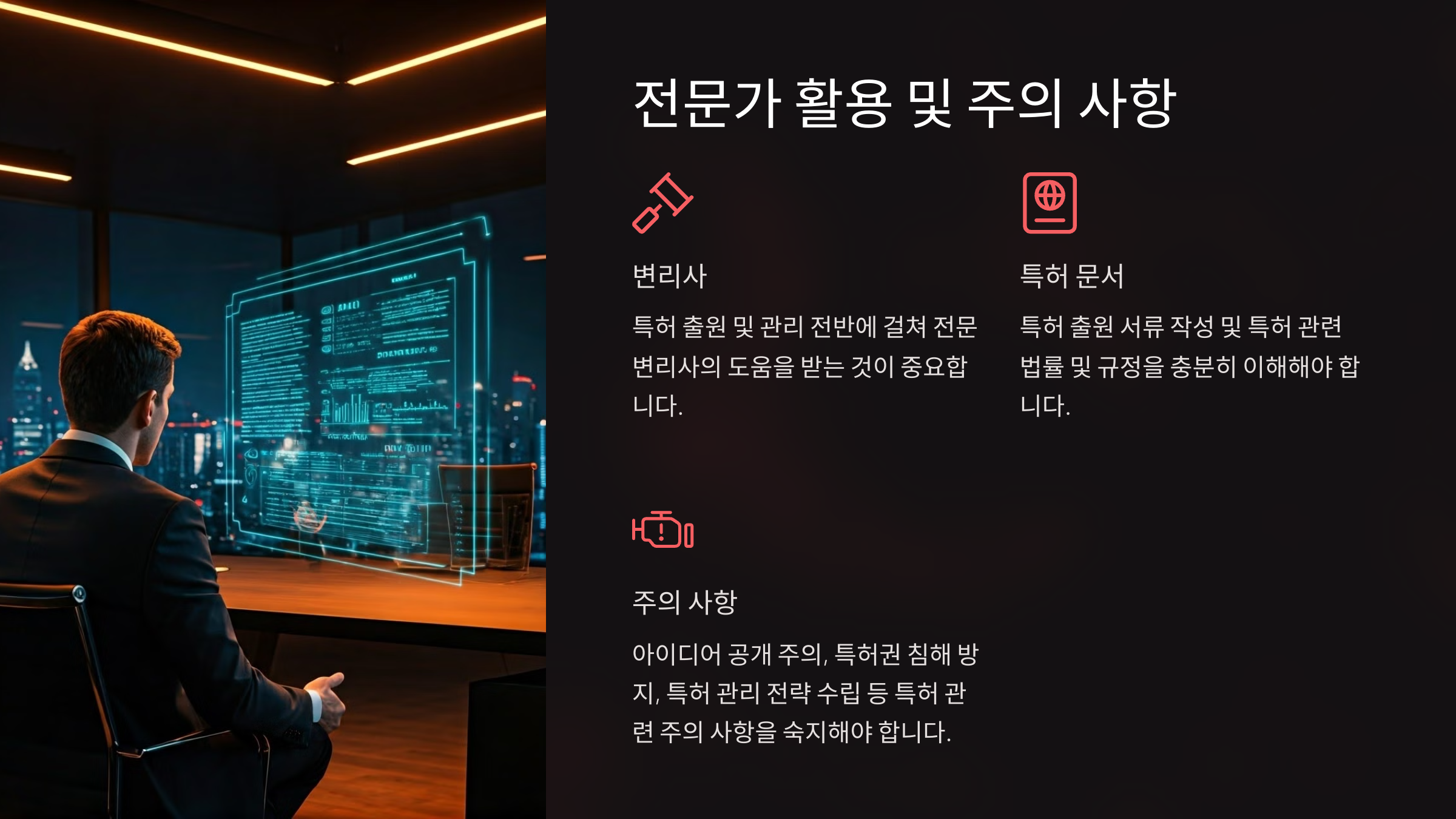 하지만 전문가를 선택할 때는 신뢰성과 경력을 꼼꼼히 확인해야 해요. 잘못된 조언이나 미숙한 서류 작업으로 인해 특허가 거절되는 경우도 있기 때문이에요.