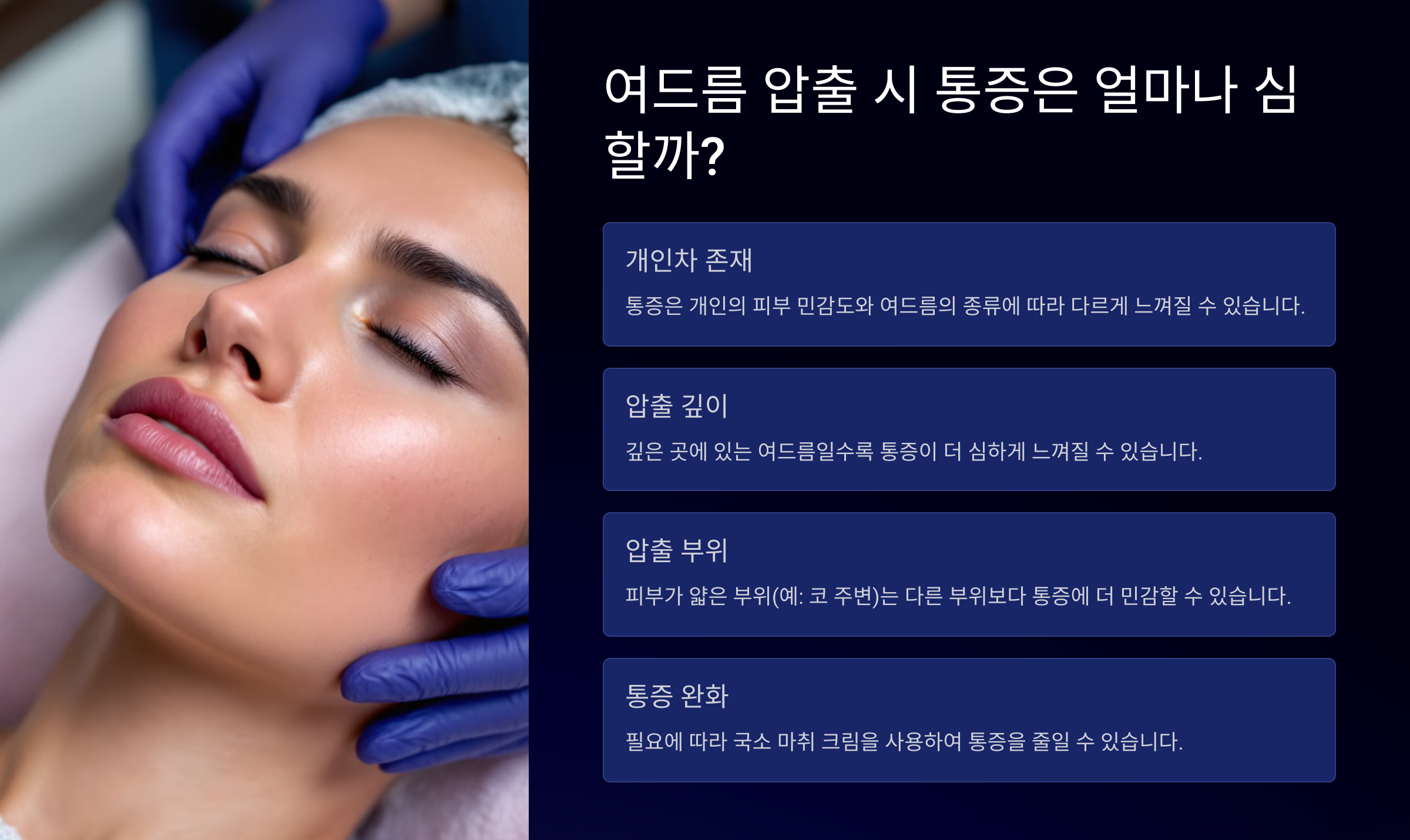 A3. 통증이 심한 경우 국소 마취 크림을 사용하거나 압출 강도를 조절할 수 있어요. 전문의에게 미리 알려주세요.
