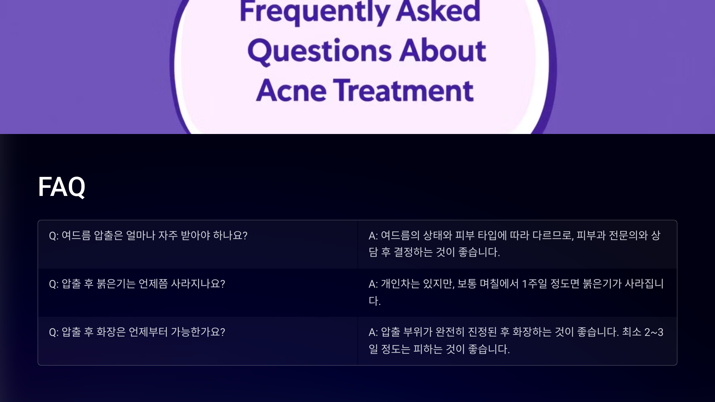 A6. 여드름의 상태에 따라 달라요. 지속적인 관리와 함께 피부 개선을 목표로 압출을 병행하는 것이 좋아요.