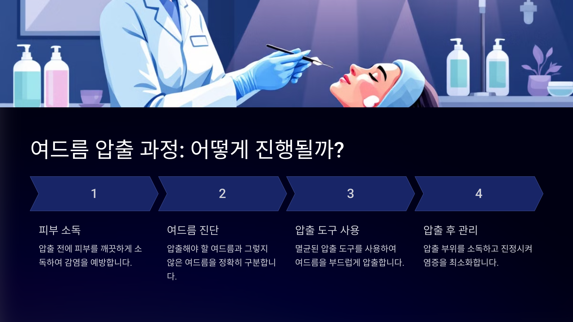 여드름 압출은 크게 다음과 같은 단계로 진행돼요: