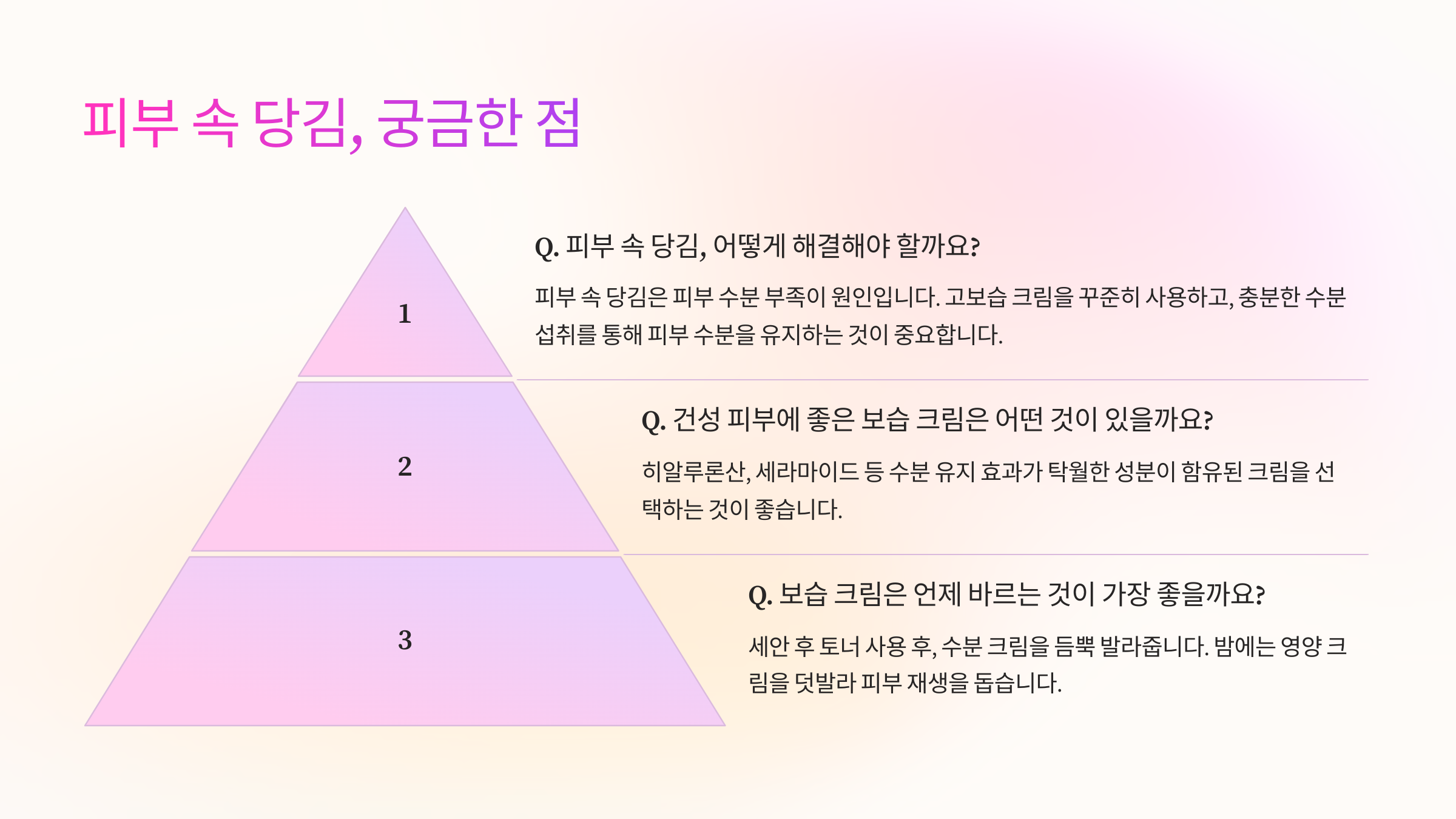 A3. 수분 공급이 빠른 세럼과 함께 초보습 크림을 사용하는 것이 효과적이에요. 이중 보습 레이어링도 추천해요.