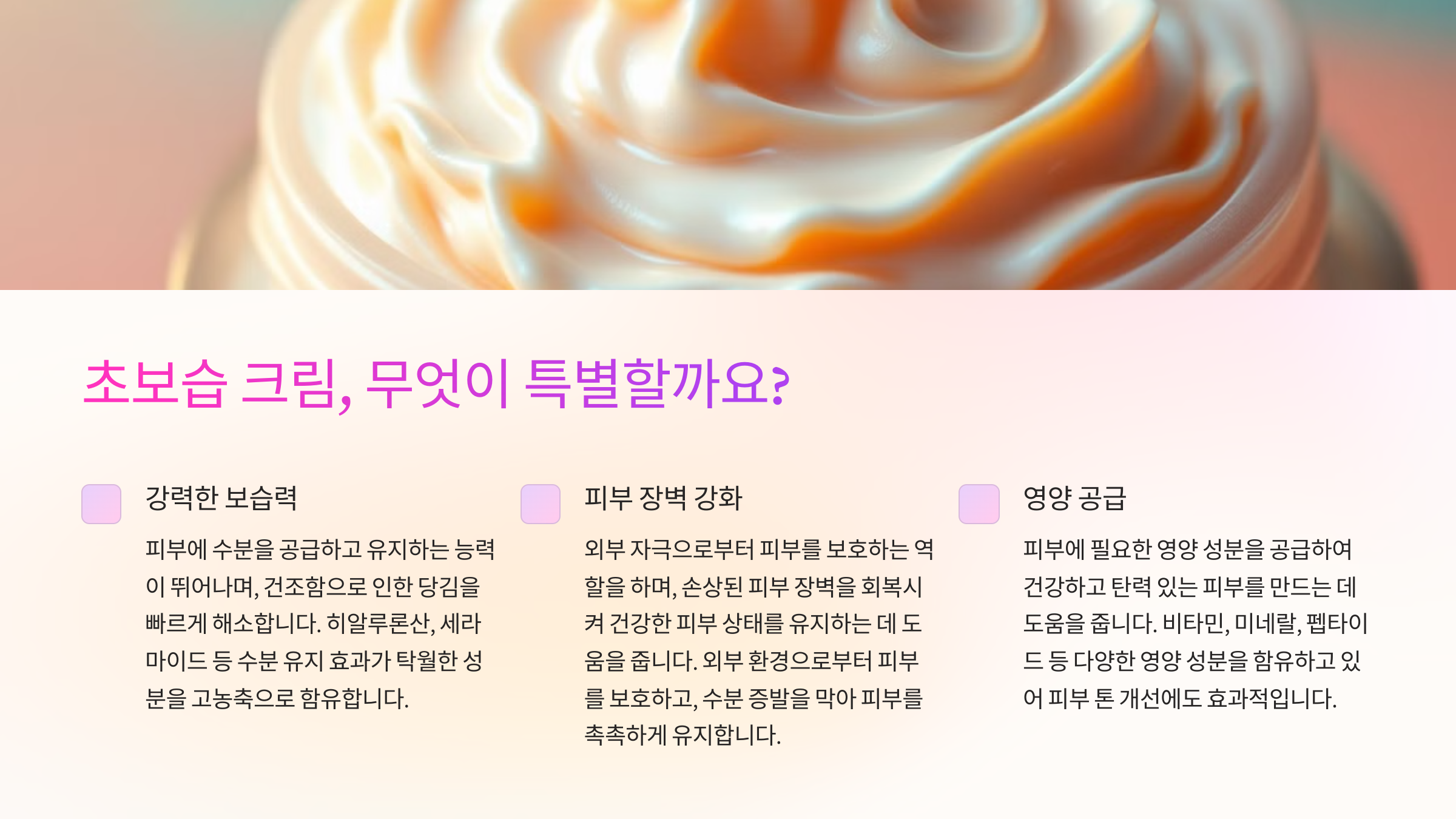 초보습 크림은 피부 속까지 수분을 공급하고, 수분이 증발되지 않도록 막아주는 보호막 역할을 해요. 주요 성분으로는 히알루론산, 세라마이드, 스쿠알란, 판테놀 등이 포함되어 있어요. 이 성분들은 피부에 빠르게 흡수되어 깊은 보습 효과를 제공한답니다.
