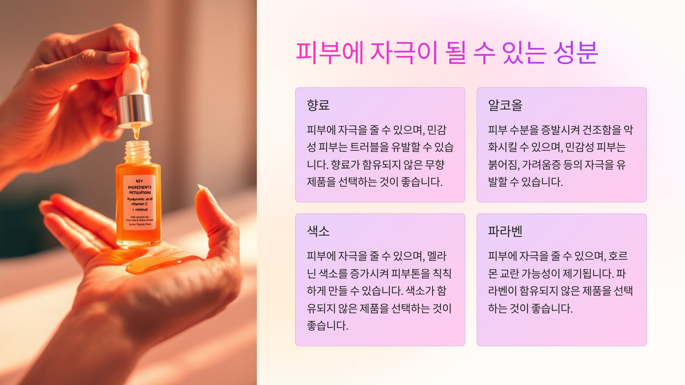 피부에 자극을 줄 수 있는 성분을 피하는 것도 중요해요. 특히 알코올, 향료, 파라벤, 인공 색소가 포함된 제품은 속건조를 악화시키거나 피부 트러블을 유발할 수 있어요. 민감성 피부라면 성분표를 확인하는 습관이 필요해요.