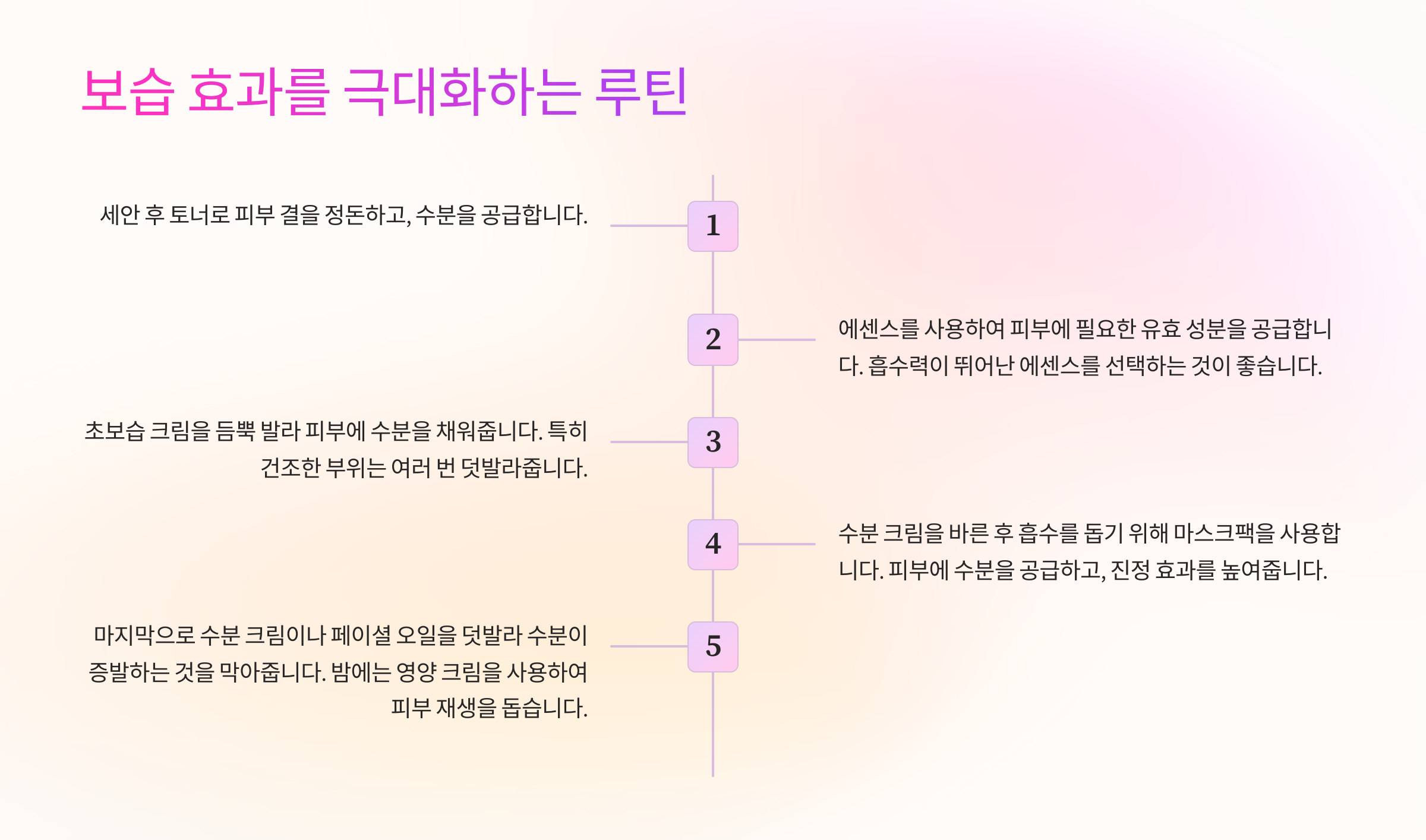 보습 크림의 효과를 최대화하려면 올바른 사용 순서를 따르는 것이 중요해요. 먼저 토너로 피부 결을 정돈한 뒤 세럼이나 에센스를 사용해 피부에 수분을 공급하세요. 이후 초보습 크림을 사용해 수분이 날아가지 않도록 막을 형성해 주세요.