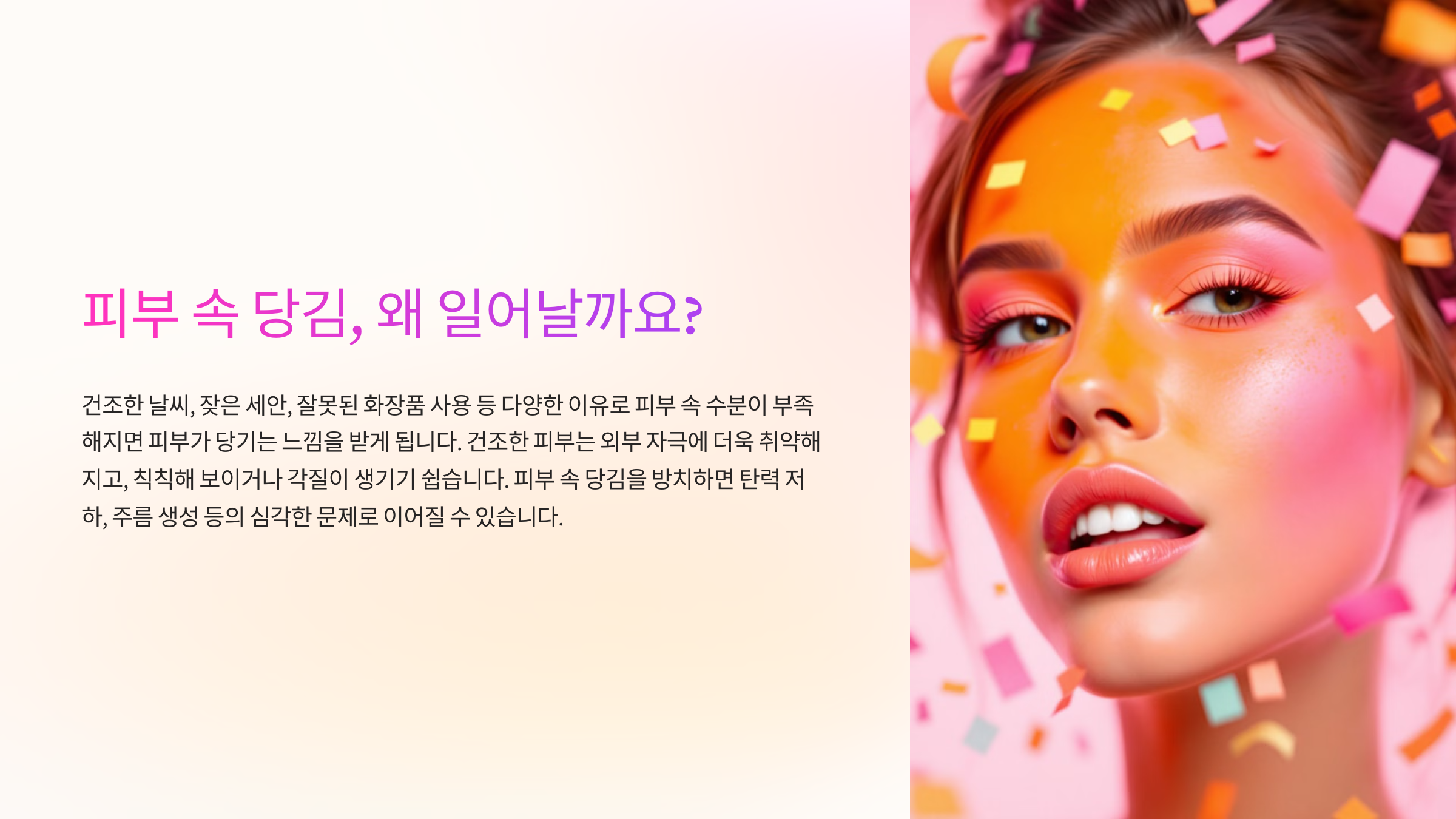 피부 속 당김은 주로 수분 부족에서 시작돼요. 피부는 겉으로는 촉촉해 보이지만, 피부 내부가 건조한 상태인 '속건조'가 원인이 될 수 있어요. 특히 차갑고 건조한 계절이나 에어컨, 난방과 같은 환경은 피부 속 수분을 빠르게 빼앗아갈 수 있답니다.