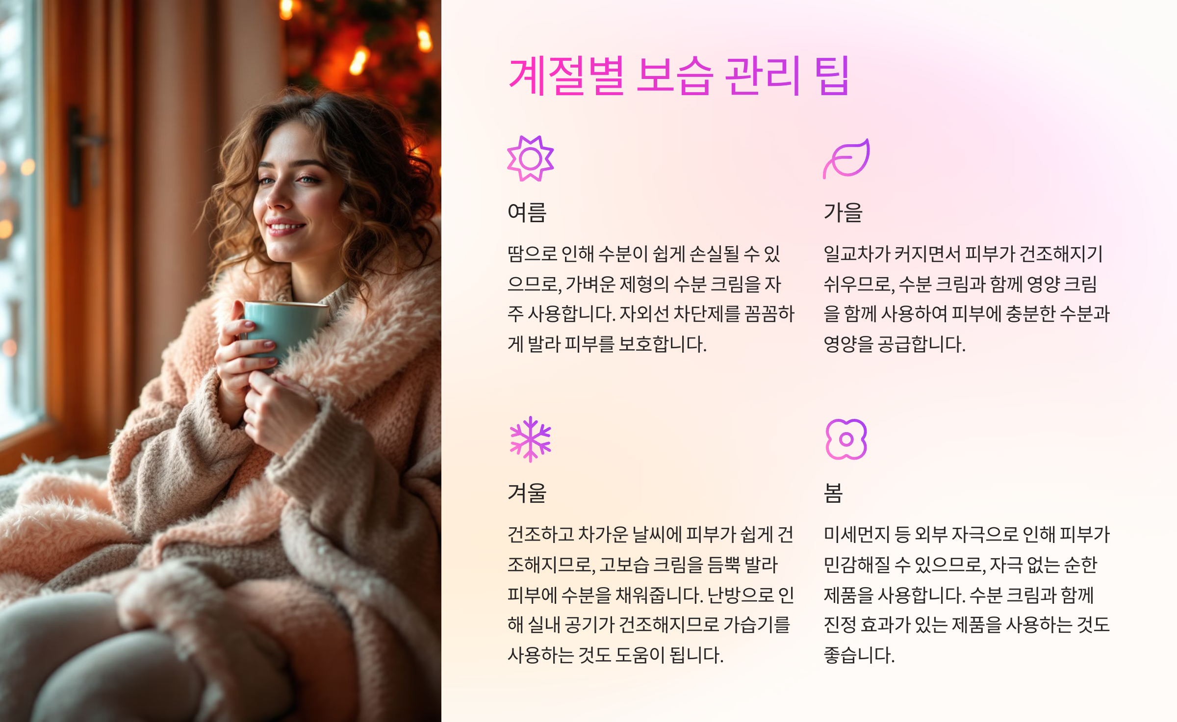 겨울철에는 보습력이 강한 리치한 크림과 오일을 함께 사용해 보습력을 높이는 것이 좋아요. 반면, 여름철에는 끈적이지 않는 가벼운 젤 타입 크림을 사용하는 것이 효과적이에요.