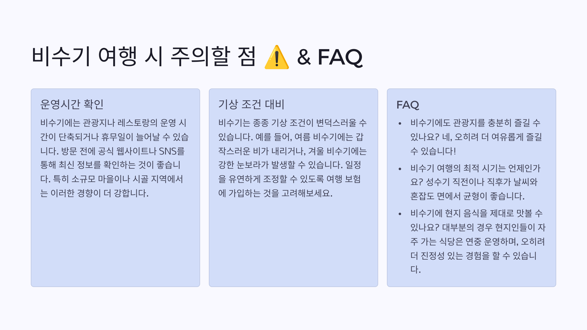 📌 다음 섹션에서는 비수기 여행 시 주의할 점을 알려드릴게요! ⚠️