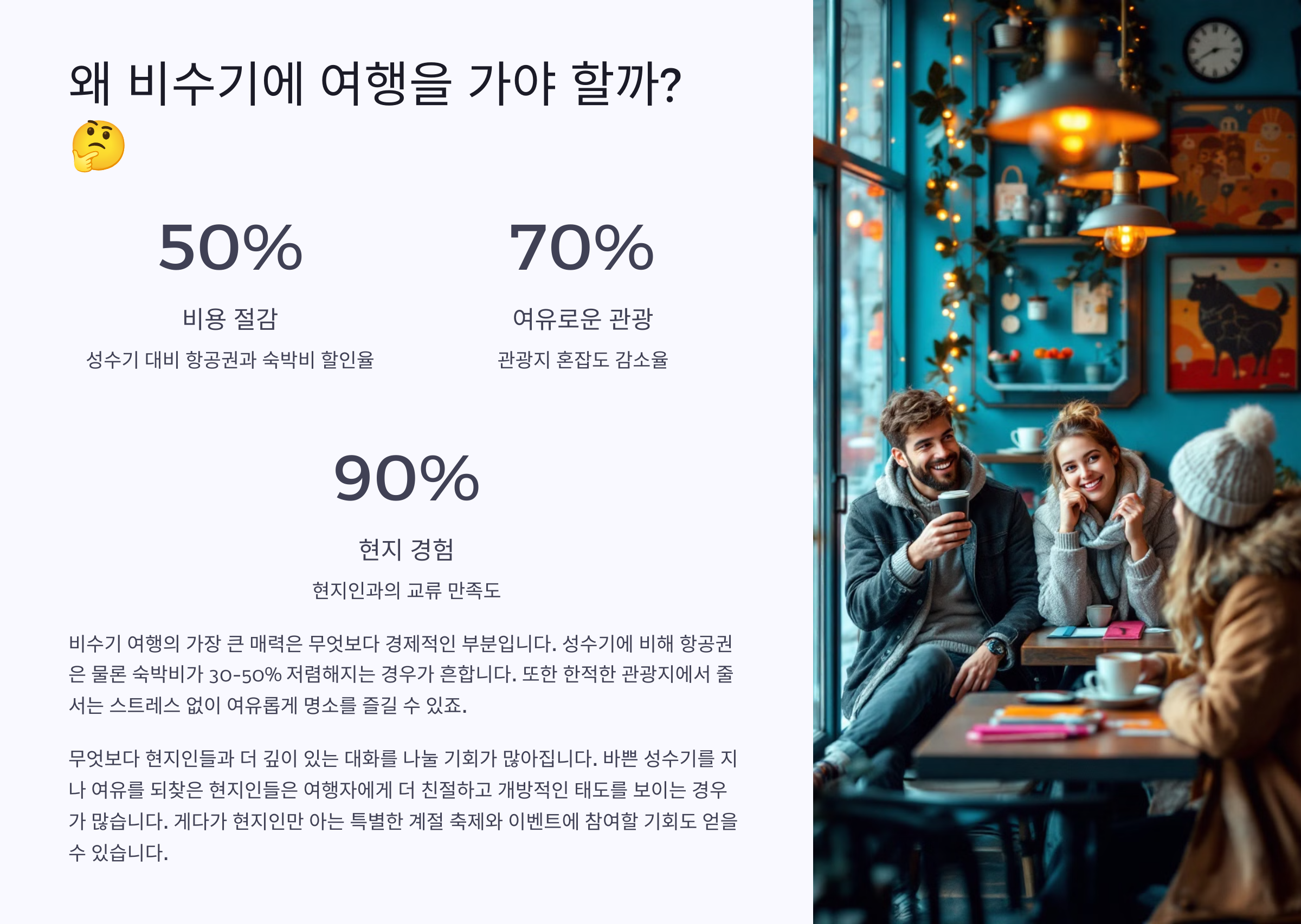 이렇게 보면, 성수기에 가야 할 이유가 거의 없죠? 😉 특히 비용 절감과 여행의 질을 고려한다면, 비수기 여행이 훨씬 더 매력적이에요!