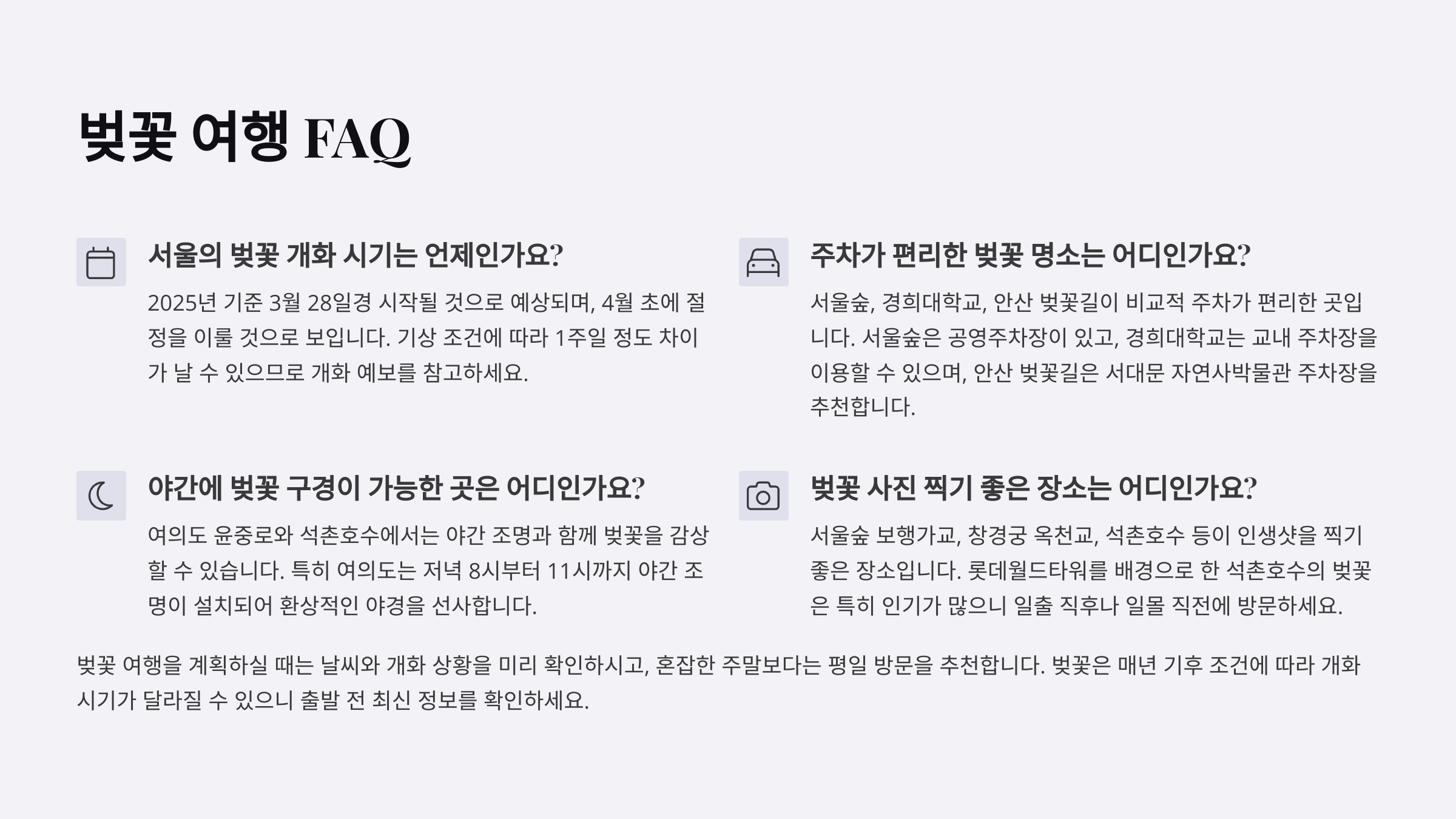 📸 다음은 서울 벚꽃 포토존 위치 가이드와 혼잡 피하는 팁, 마지막으로 FAQ 8개로 마무리할게요!