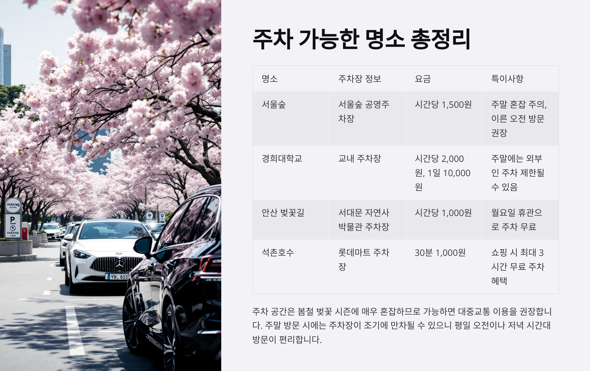 벚꽃 시즌엔 주차가 제일 고민이죠! 하지만 미리 알아두면 스트레스 없이 벚꽃 나들이를 즐길 수 있어요. 아래 표에 서울 주요 벚꽃 명소 주차장 정보 정리해뒀어요.