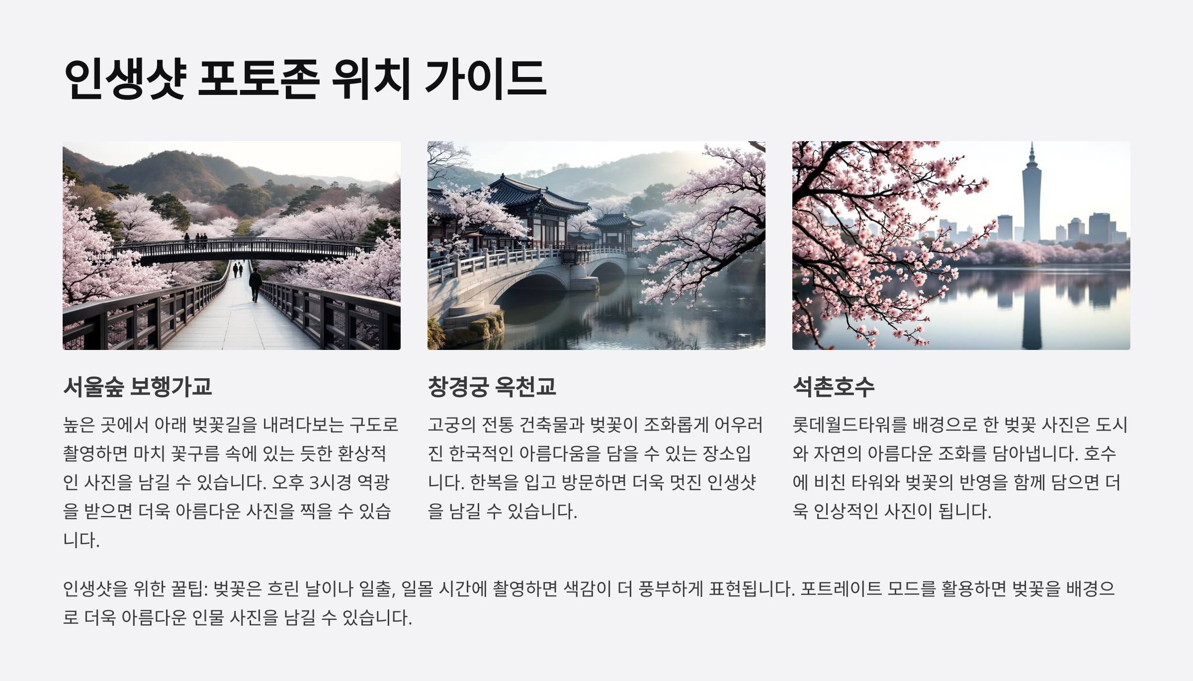 여의도 윤중로의 ‘벚꽃터널’은 가장 인기 있는 포토존이에요. 나무가 길게 이어진 터널 안에서 찍으면 핑크빛 배경이 완성돼요. 석촌호수는 반영샷 명소, 특히 동호 남단이 사진 맛집이에요.