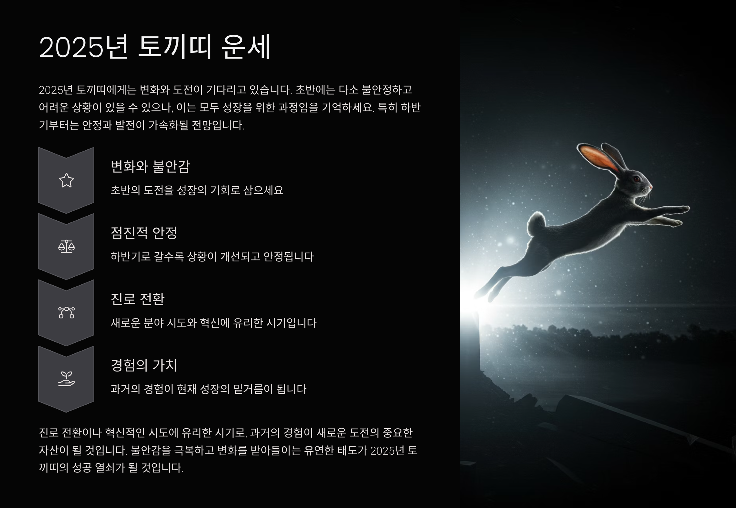 이제 다음 띠, 토끼띠 운세로 넘어가 볼까요? 🐰 2025년 토끼띠의 흐름도 바로 이어집니다!