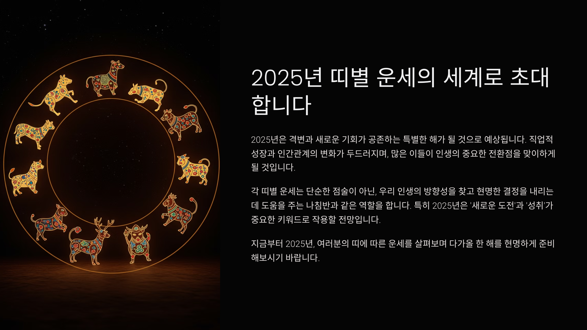 자, 이제 본격적으로 띠별로 2025년 어떤 기운이 흐르는지, 구체적으로 살펴볼 시간이에요. 당신의 띠는 어떤 운세를 가지고 있을까요? 다음 섹션에서 확인해봐요!