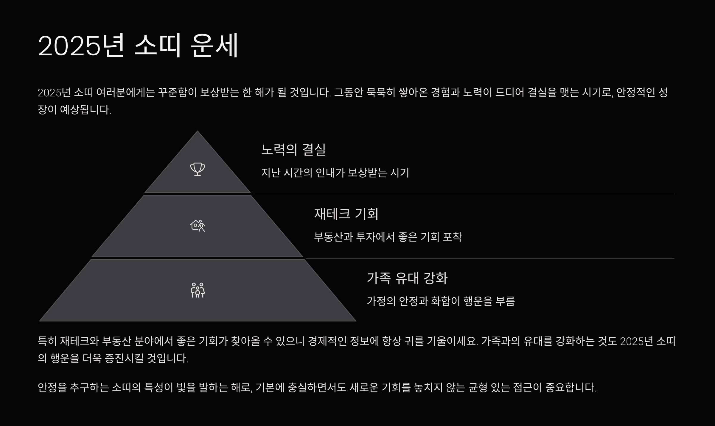 2025년은 전반적으로 **대인관계, 감정의 균형, 금전 흐름**이 중요한 시기로 평가돼요. 급변하는 시대 흐름 속에서 감정적인 대응보다는, 전략적인 판단과 신중한 행동이 요구되는 한 해랍니다. 특히 인간관계를 잘 다스리는 이들은 뜻밖의 도움과 기회를 얻게 될 수 있어요.