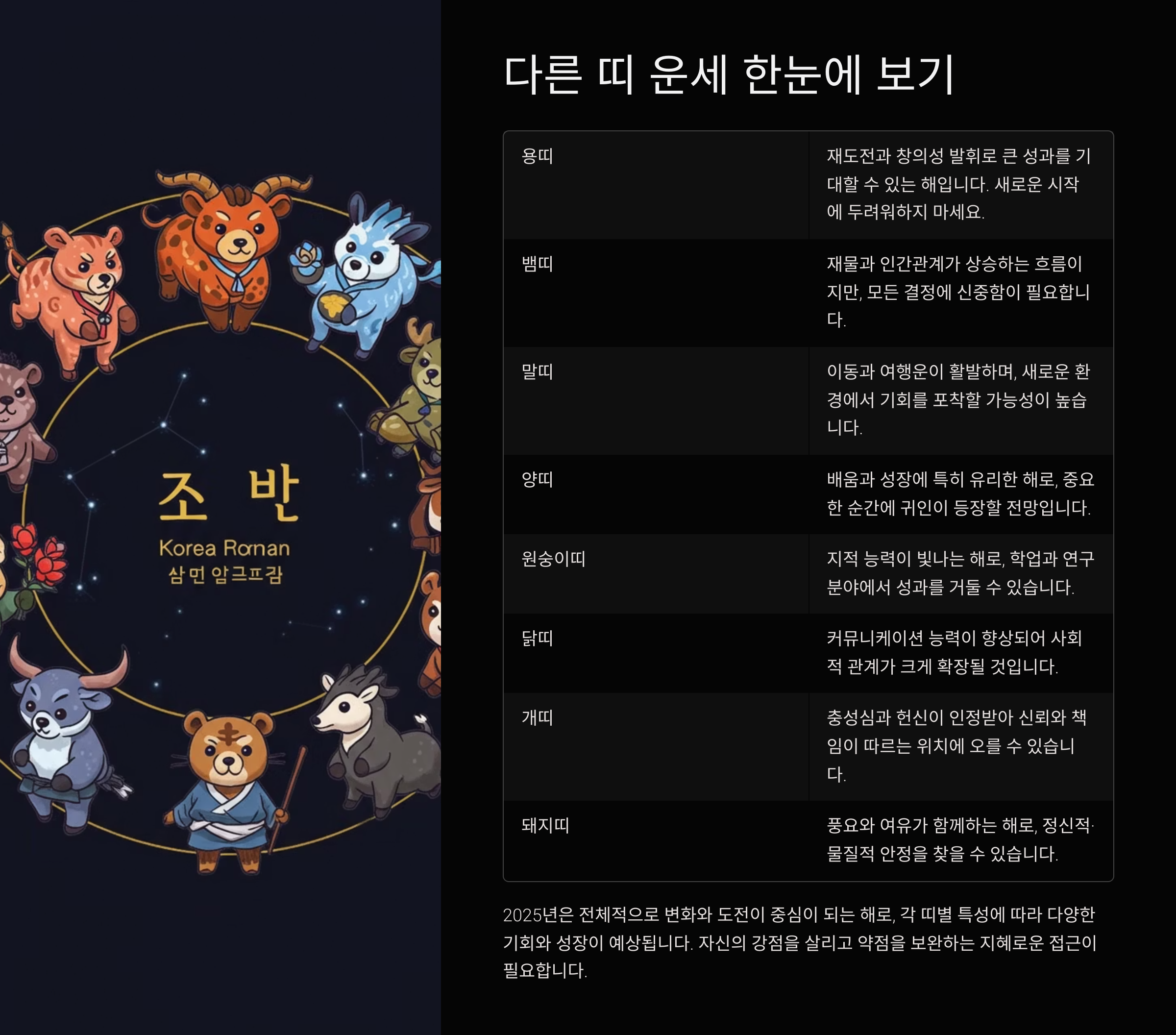 | 띠 | 2025년 핵심 키워드 | 운세 요약 |