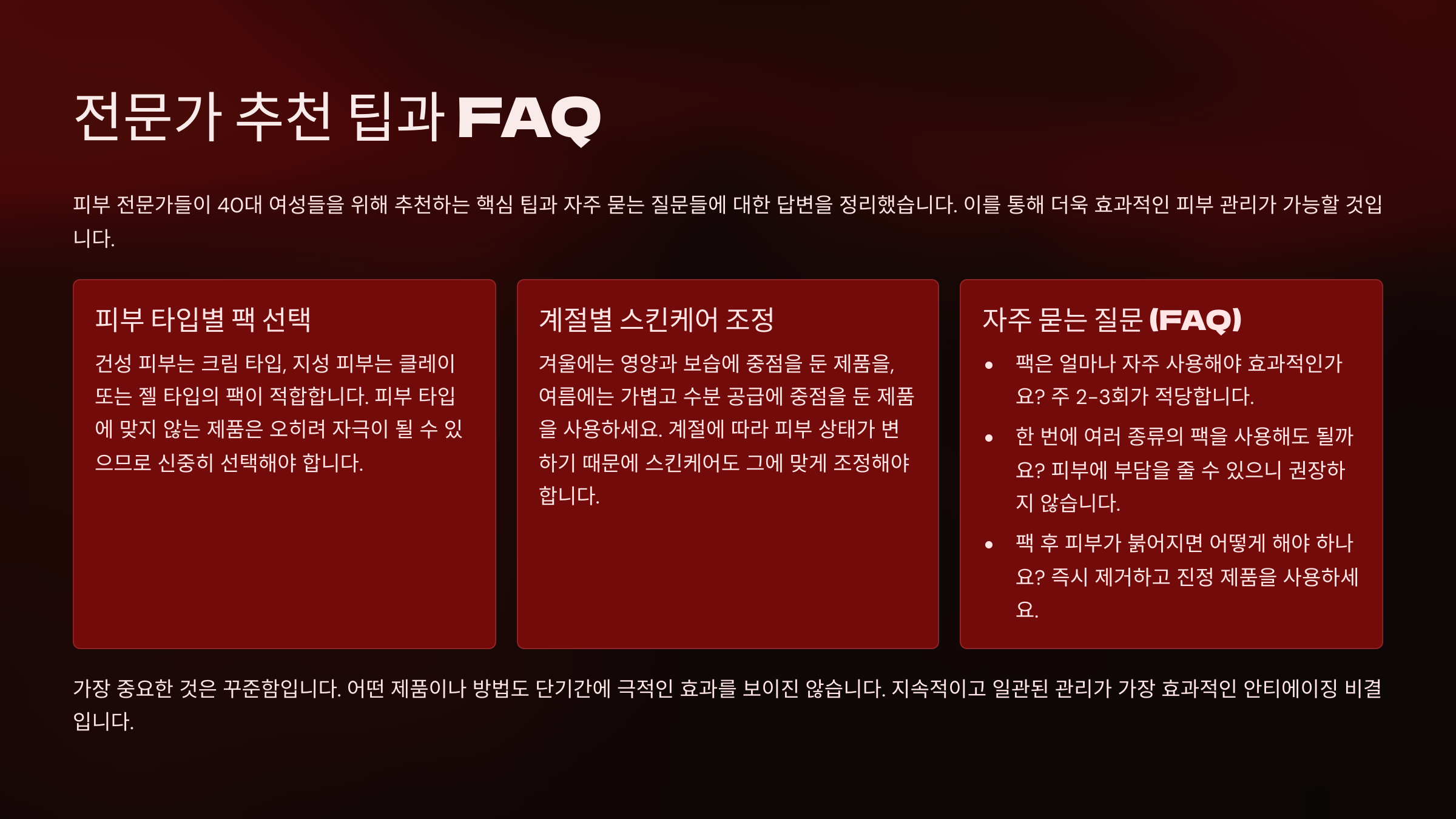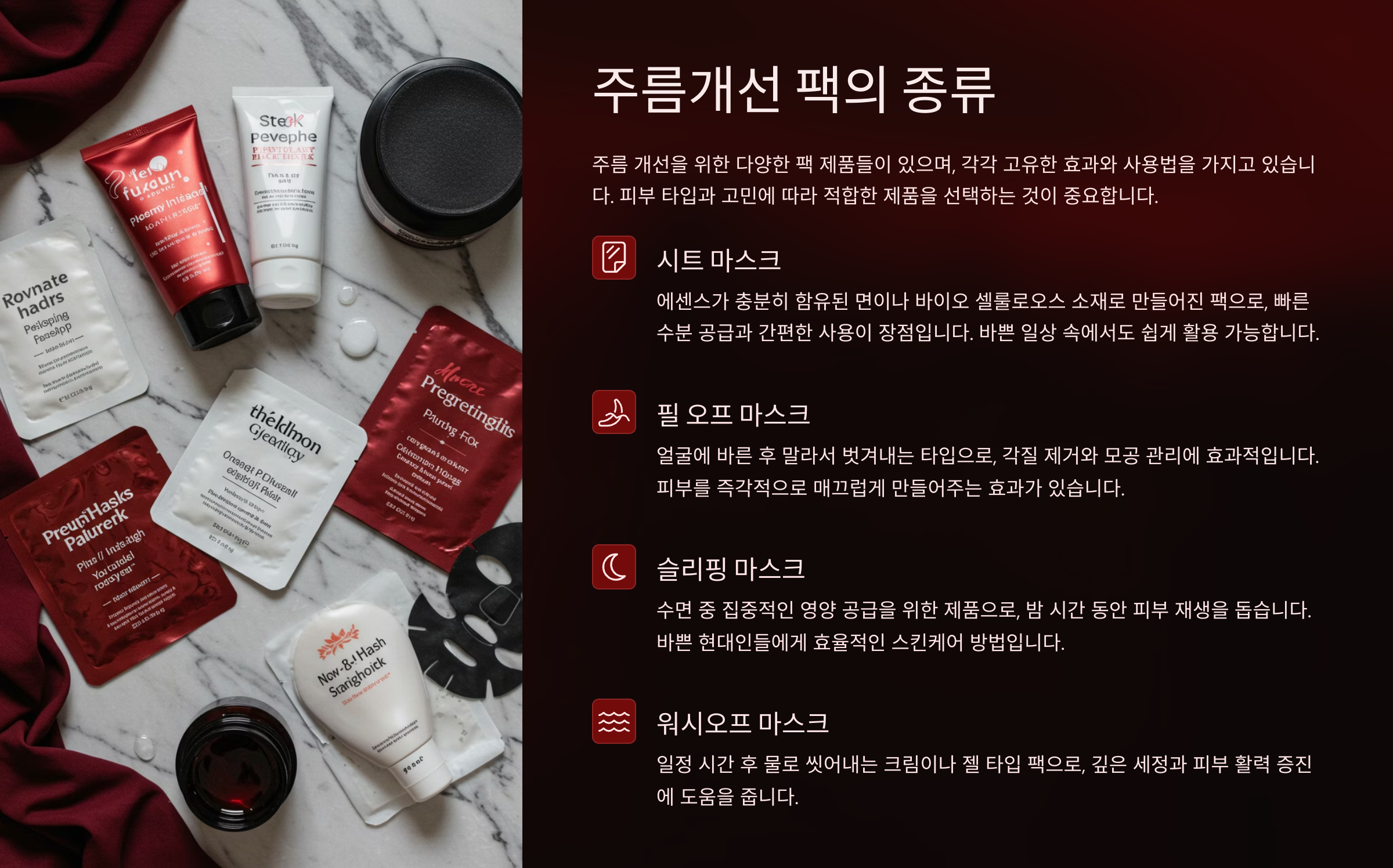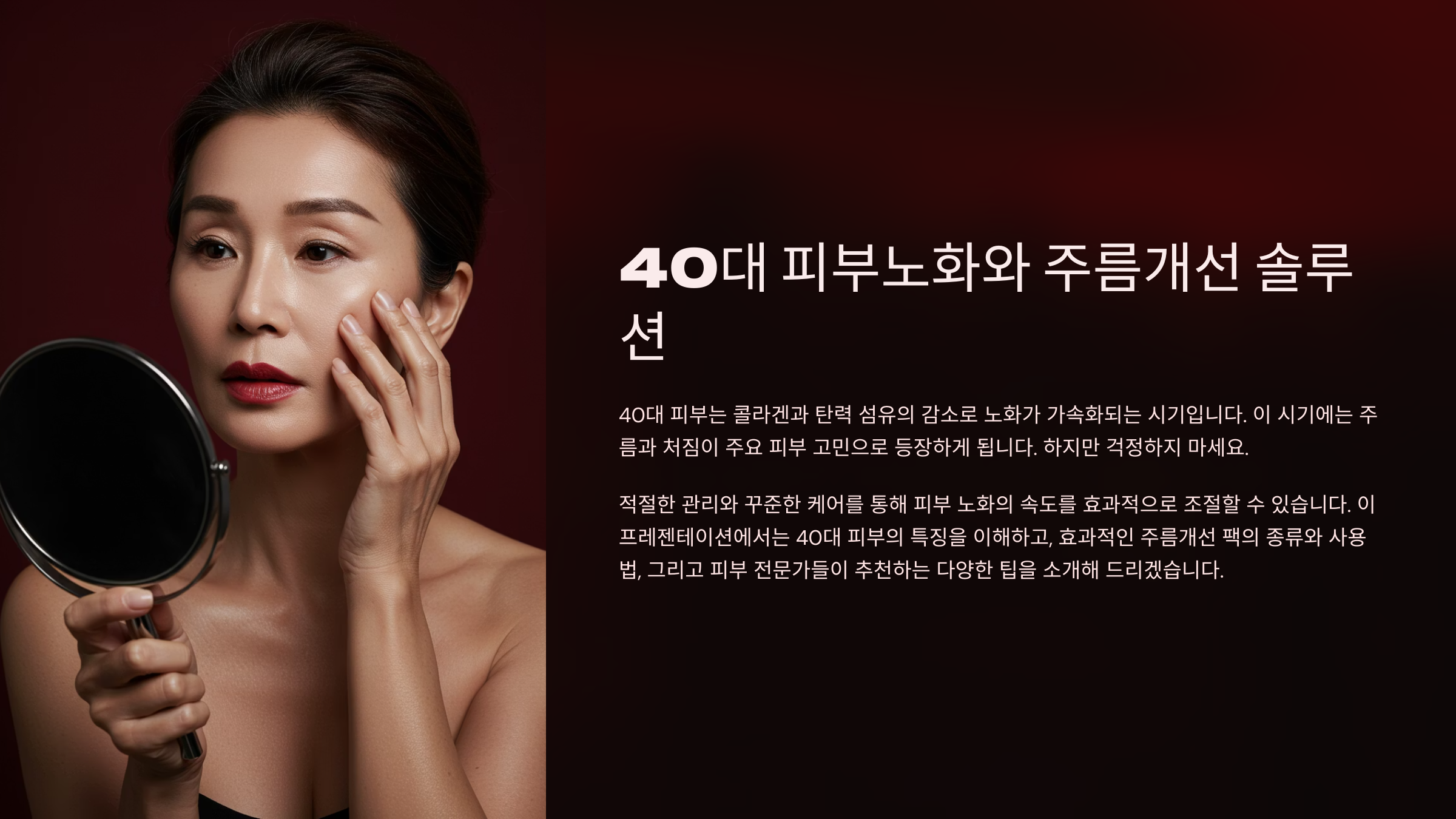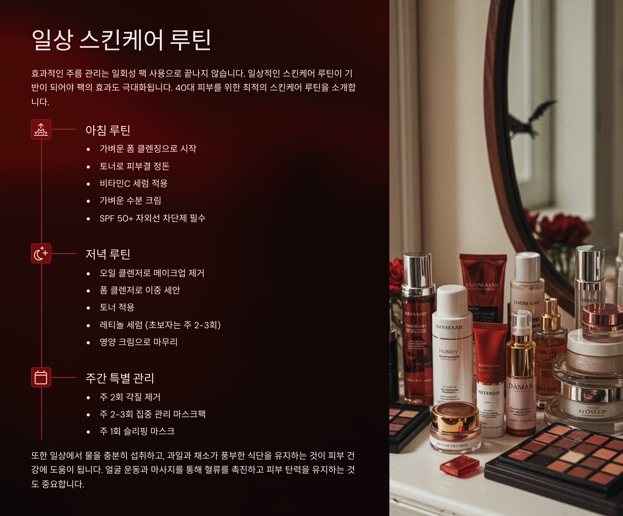 40대 피부의 특징을 이해하고 나면, 왜 주름개선 팩이 필요한지 명확해져요. 일반적인 스킨케어만으로는 이미 시작된 노화 현상을 되돌리기 어렵기 때문에, 더 강력하고 집중적인 케어가 필요한 거죠! 🌟