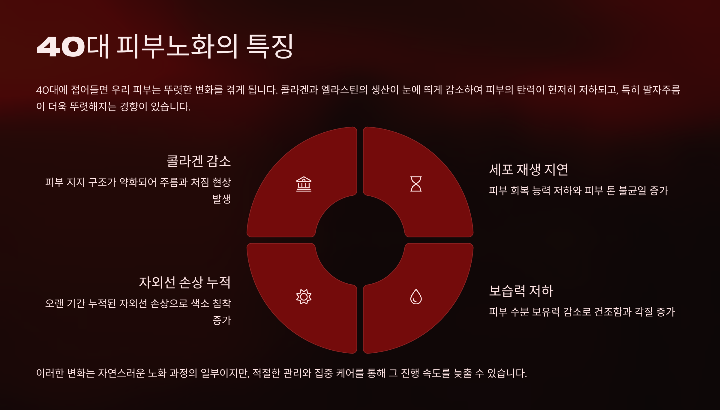 | 40대 후반 | 깊은 주름 형성 | 전문적 관리 필요 |
