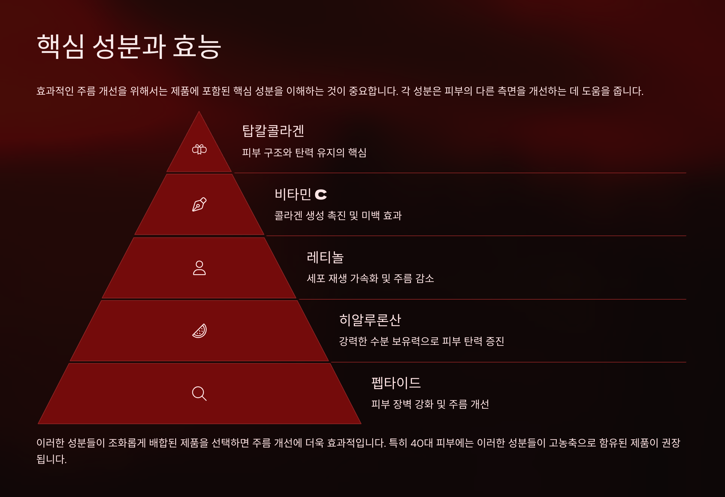 성분을 선택할 때는 자신의 피부 상태와 목적에 맞게 고르는 것이 중요해요. 깊은 주름에는 레티놀이나 펩타이드를, 건조한 피부에는 히알루론산이 함유된 제품을 선택하면 좋답니다! 🌿